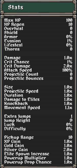 Stats are the individual aspects of your character that items, weapons, tomes, and shrines increase during a run. Focusing on specific stats for your build is crucial to success.